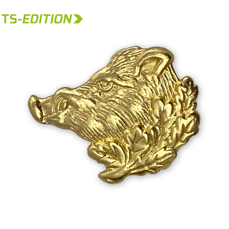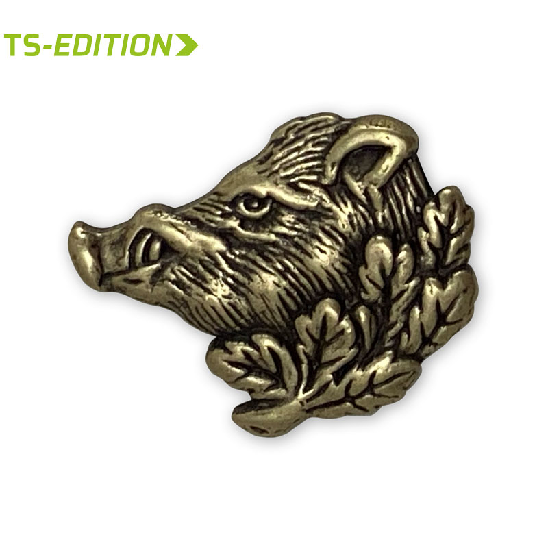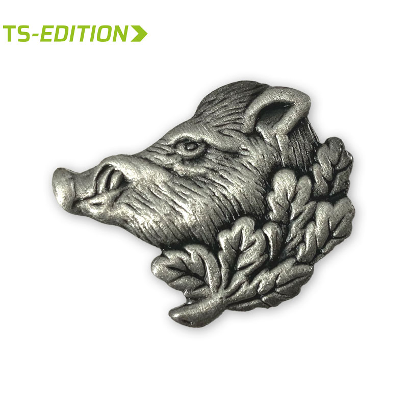 ist ein Must-have für alle passionierten SchwarzwildjägerInnen. Das Motiv ist ein sehr detailreich gearbeiteter Keilerkopf mit Eichenlaub und in 3 Farblegierungen erhältlich. Neben dem gewohnten altsilber ist der Keilerkopf-Pin ab sofort auch in vergoldet und bronziert erhältlich. Befestigt wird er mit der rückwärtig angebrachten Sicherheitsnadel.