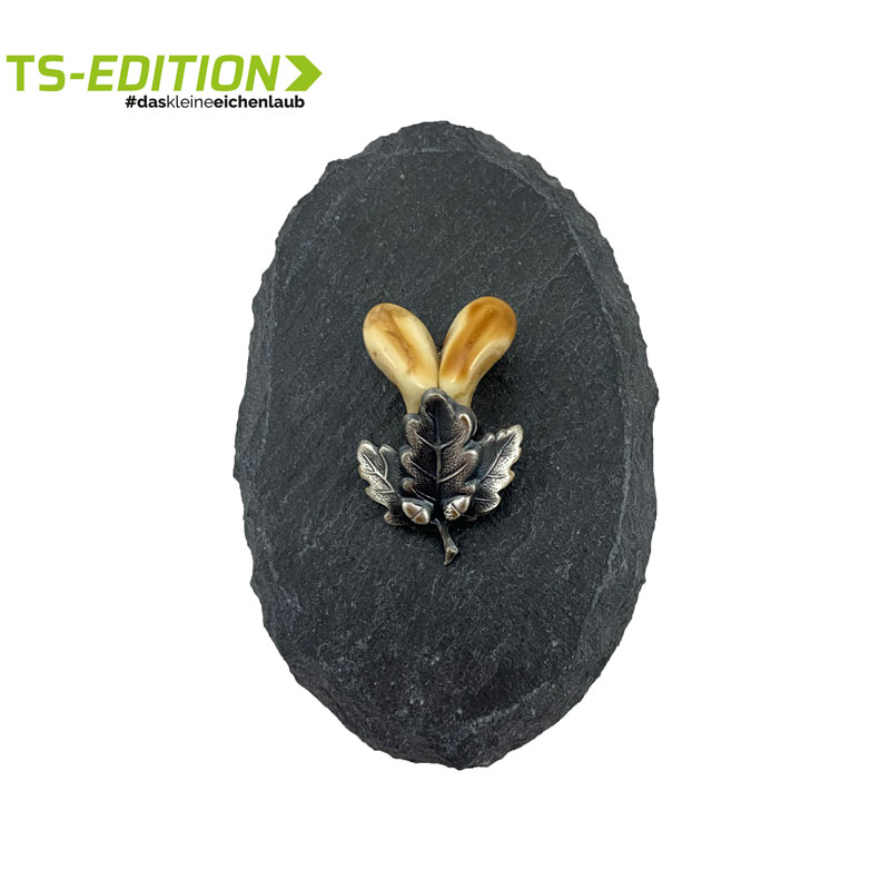 Mobile Preview: Montagebeispiel: das kleine Eichenlaub in altsilber mit Grandeln auf Trophäenschiefer