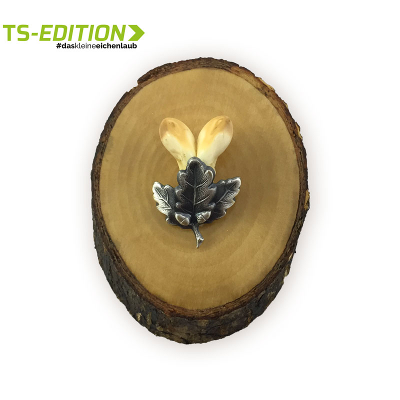 Montagebeispiel: das kleine Eichenlaub in altsilber mit Grandeln auf Naturholzscheibe