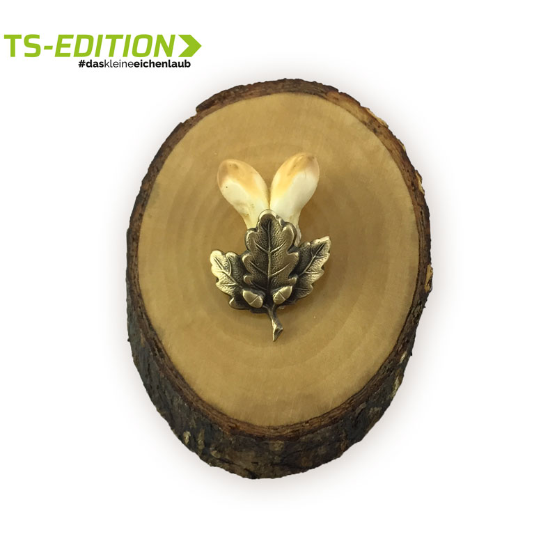 Mobile Preview: Montagebeispiel: das kleine Eichenlaub in bronze mit Grandeln auf Naturholzscheibe