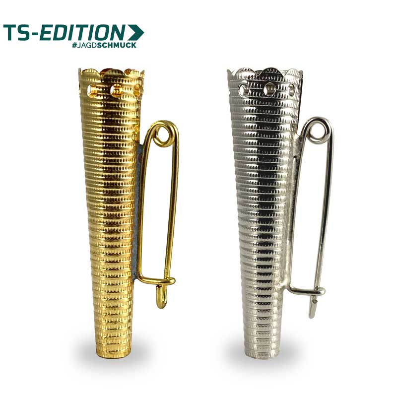 sind sehr ansprechende, metallene runde Halterung für kleine Sau- Gams- und Hirschbärte – wahlweise in silber- oder goldfarben. Die durchgängig geriffelte Struktur und die Verzierung am oberen Ende geben der kleinen Hülse eine dezente und elegante Optik.