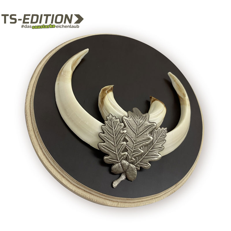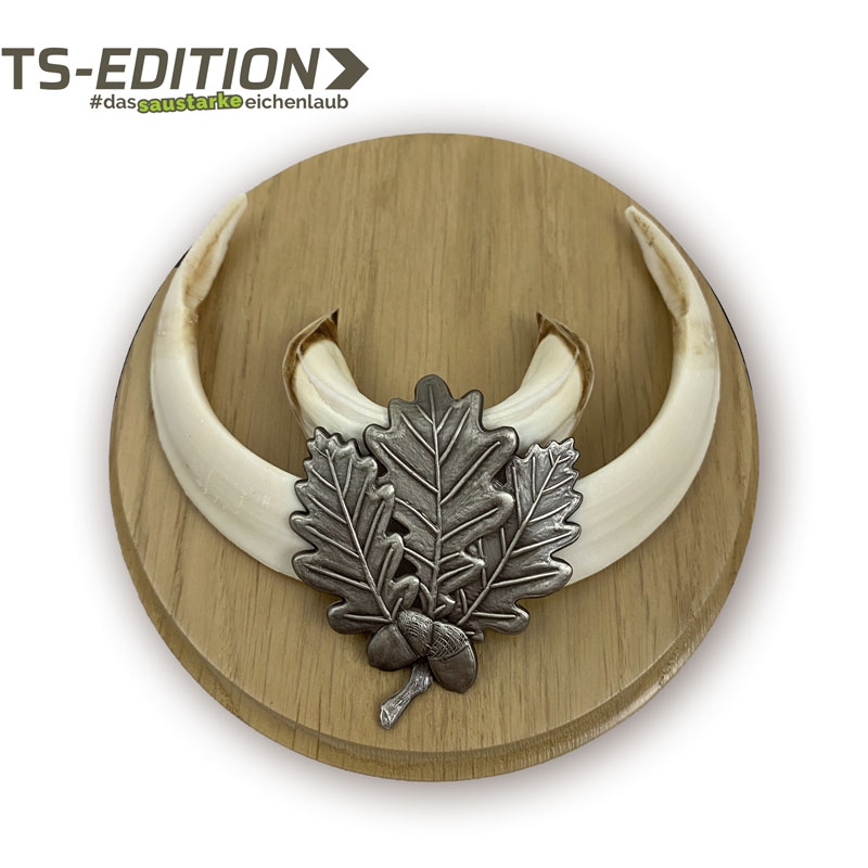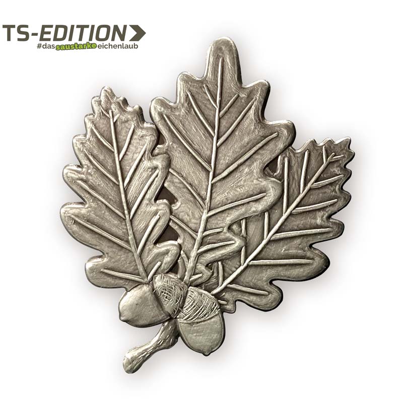 aus unserer TS-EDITION ist ein aus Messing, hohl geprägtes, versilbertes Abdecklaub, welches abschließend noch geschwärzt und gebürstet wird. Ein wunderschönes Eichenlaub zur dekorativen Abdeckung Ihrer Schwarzwildwaffen.