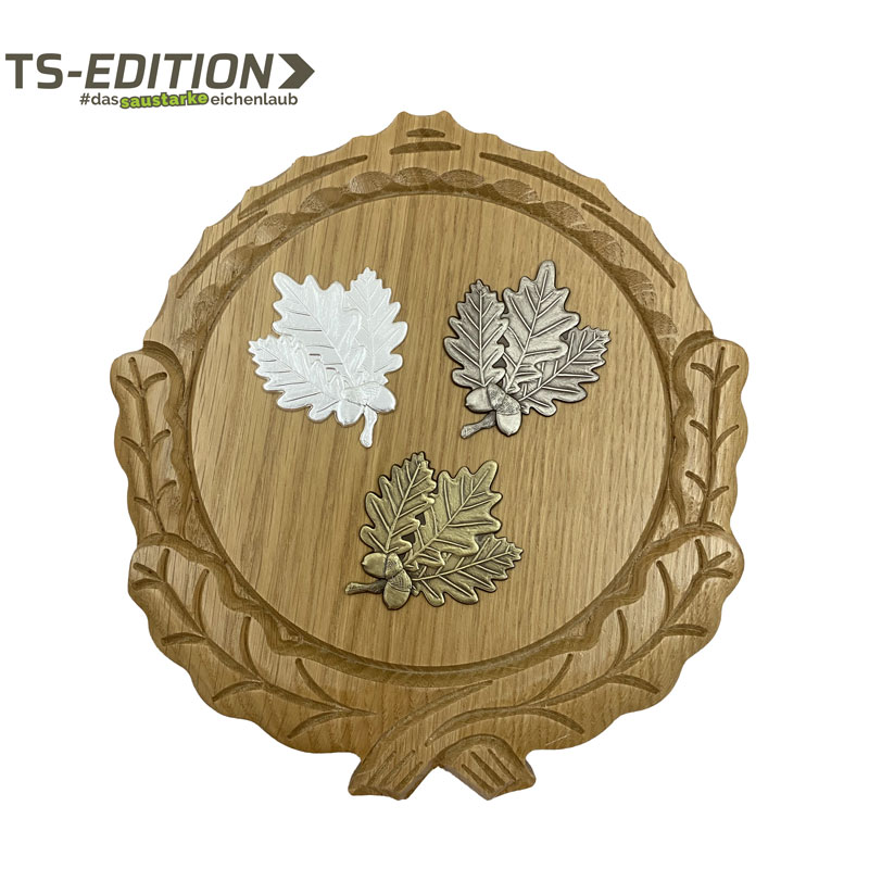 Mobile Preview: Das saustarke Eichenlaub TS-EDITION auf Eiche hell geschnitzt – silber, bronze, altsilber