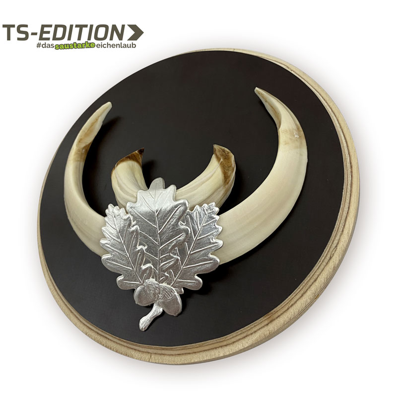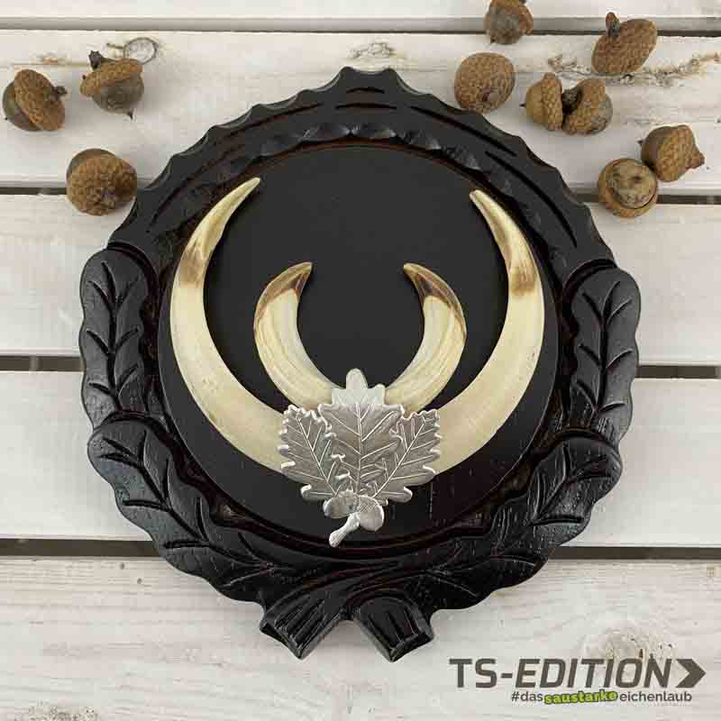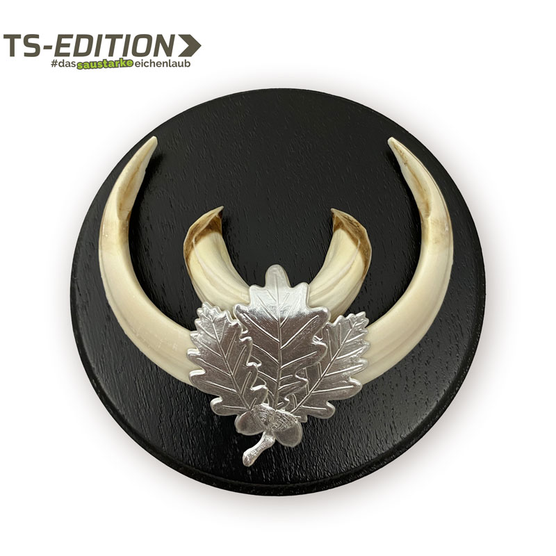 Das saustarke Eichenlaub TS-EDITION versilbert mit Keilerwaffen auf Eiche dunkel