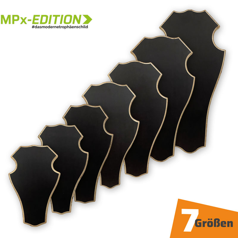 ist ein modernes, handwerklich gefertigtes Trophäenschild zum Aufsetzen Ihrer Hirschtrophäe. Hier trifft eine klassische Form auf ein neues Material – die Multiplex-Platte. Der besondere Reiz der MPx‑EDITION besteht aus dem Kontrast zwischen dunkler Oberfläche und heller Kante. Das Geweihschild MPx – H1 hat eine stumpfe Spitze.