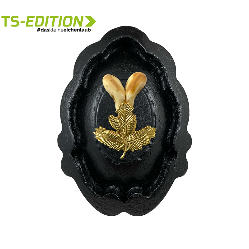 ist die ideale Kombination zum Aufsetzen Ihrer Rotwildgrandeln. Das schwarze Schildchen hat eine ebene Fläche, auf der die Grandeln positioniert werden. Abgedeckt mit einem kleinen Eichen- oder Fichtenlaub aus unserer TS‑EDITION, wird die Trophäe zu einer ansprechenden Wanddekoration.