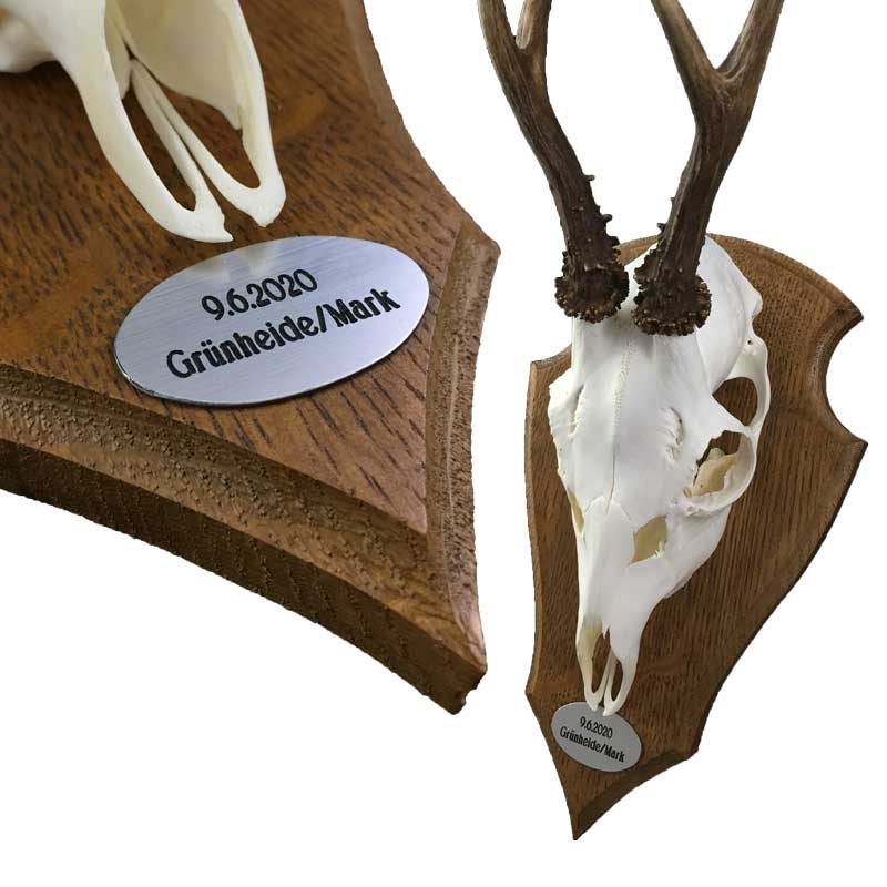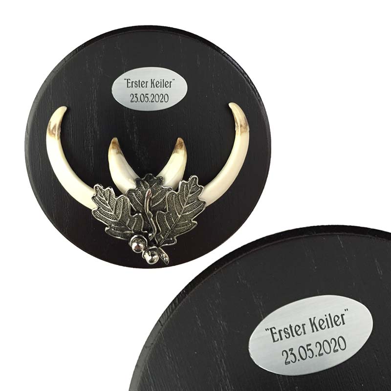 ist das ideale Dekoelement für Ihre aufgesetzten Keiler-, Bock- oder Hirschtrophäen. Hier ist Platz für Informationen rund um das Jagderlebnis, wie z. B. Datum, Name und Ort. Mit der personalisierten Plakette fällt die Trophäe sofort ins Auge.