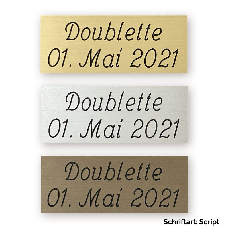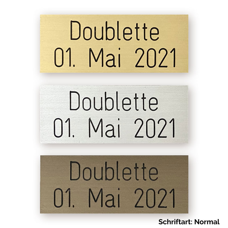 Diese Plaketten sind ca. 50x20 mm groß, bestehen aus ABS-Material und haben eine matte, reflektionsfreie Oberfläche. Die gebürstete Oberfläche gibt es in 3 Ausführungen: gold-, silber- und bronzefarbig. Die Schrift wird fräsgraviert und erscheint bei allen Varianten in Schwarz. Sie haben die Wahl zwischen 2 Schriftarten: Normal und Script. Die Plaketten sind rückseitig mit einer Selbstklebefolie ausgestattet und können einfach auf den Trophäenschildern an der gewünschten Stelle befestigt werden.