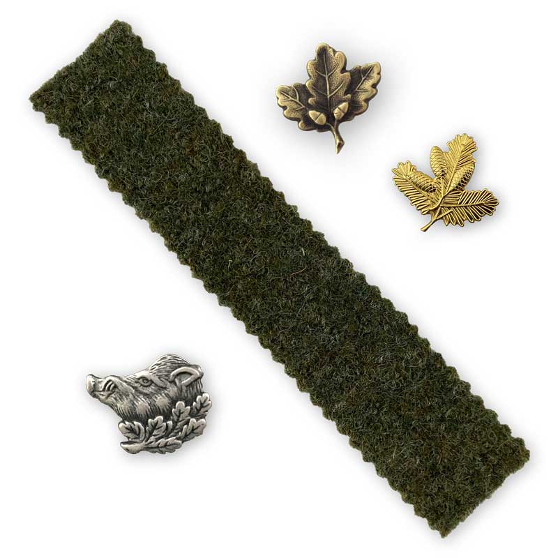 ist eine großartige Alternative zur traditionellen Eichenlaubabdeckung von Keilerwaffen. Er ist einfach in der Anbringung und somit ideal für alle Selbermacher. Der grüne Lodenstreifen ist die zeitlose Basis, die optisch noch mit einem Dekoelement abgerundet werden kann. Wählen Sie aus den 9 verschiedenen Accessoires Ihren Favoriten.