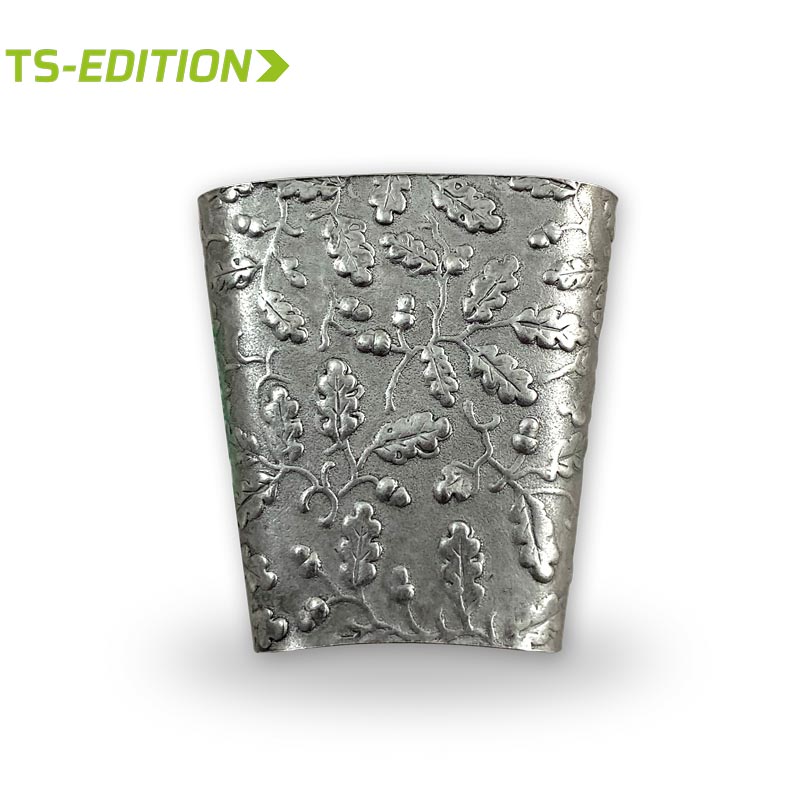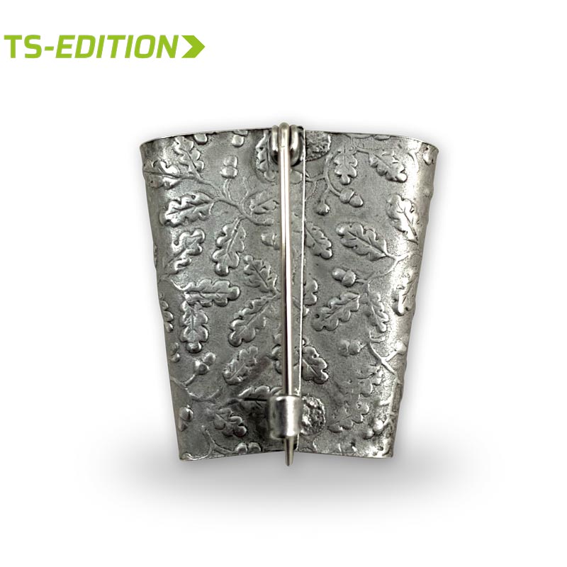 ist eine ansprechende, in Handarbeit montierte Halterung für Gams- und Saubärte. Die rundherum mit Eichenblättern verzierte Saubarthülse wirkt edel und elegant. Mit der rückwärtig angebrachten Sicherheitsnadel ist ein sicherer Halt des fertigen Gams- oder Saubarts am Hut garantiert.